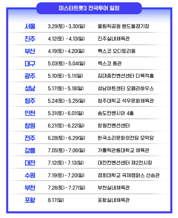 미스터트롯3 전국투어 일정 총정리 – 대구부터 서울까지 지역별 날짜 확인! 미스터트롯3 전국투어 콘서트 일정을 한눈에! 서울, 부산, 대구부터 광주, 대전까지 총 12개 도시 일정과 예매 정보,